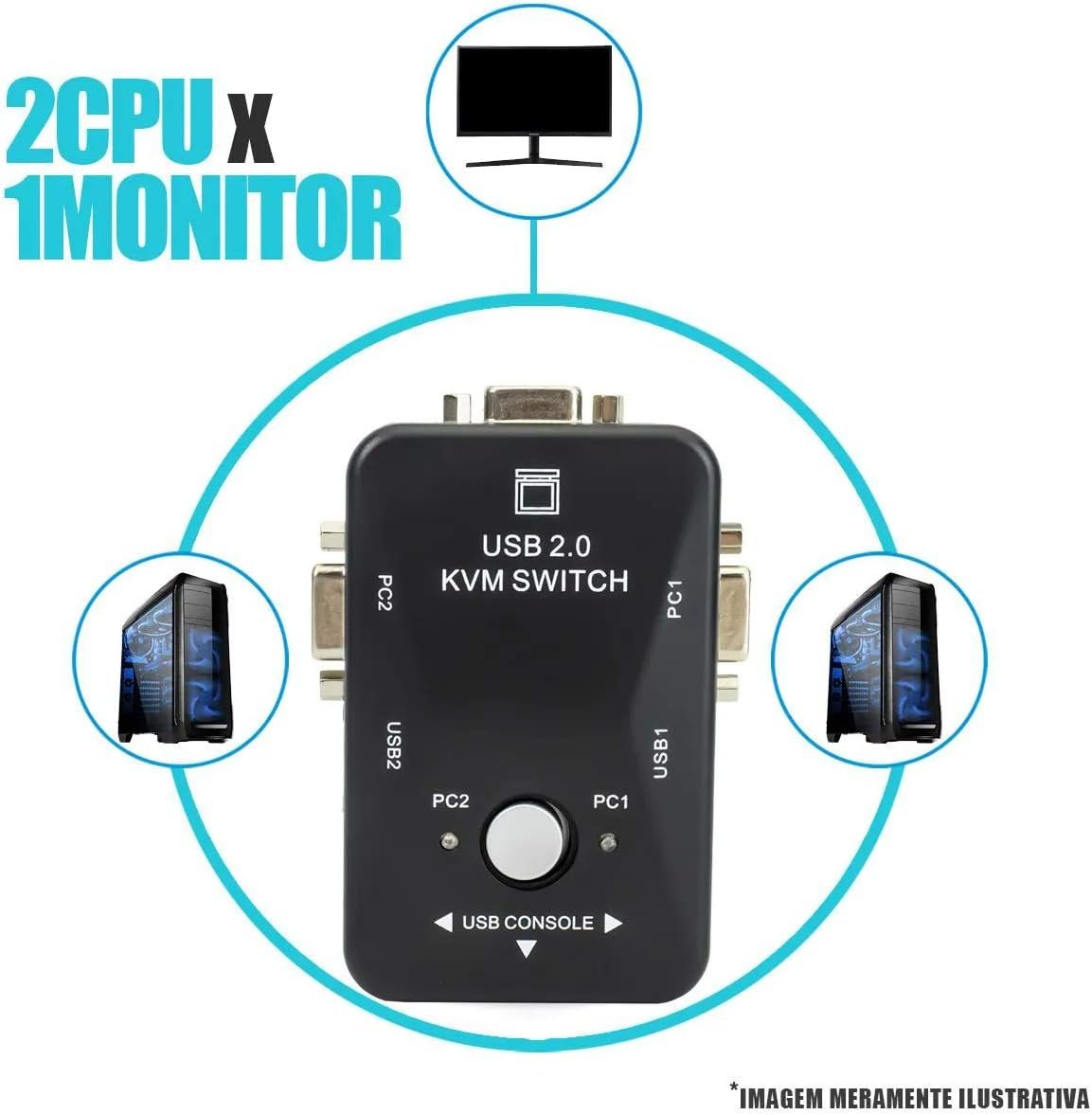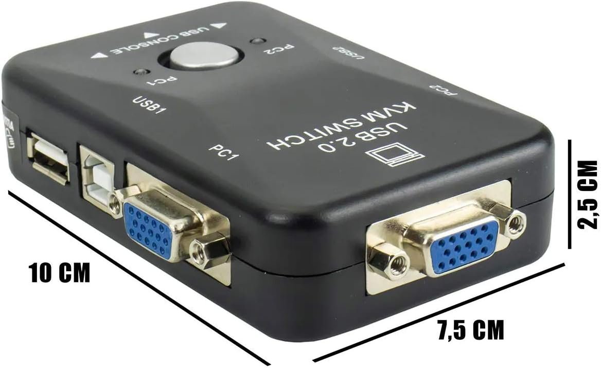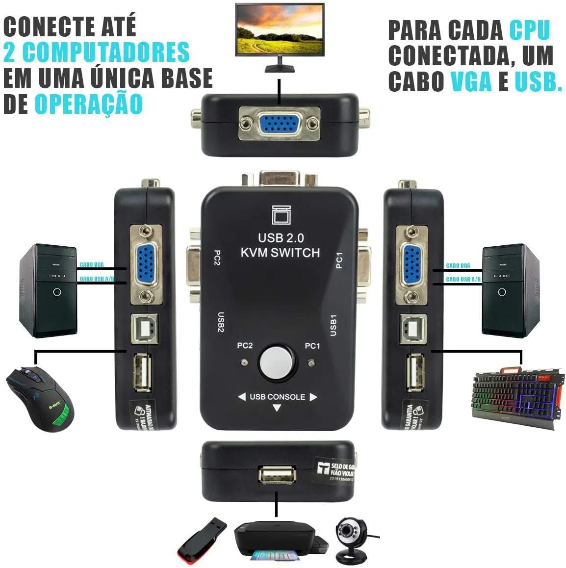 Ligue até 2 PC’s no mesmo monitor, teclado, impressora e mouse, ou seja, possibilita o uso de até 2 computadores ao mesmo tempo utilizando apenas um kit Mouse (USB), Teclado (USB) e Monitor VGA.